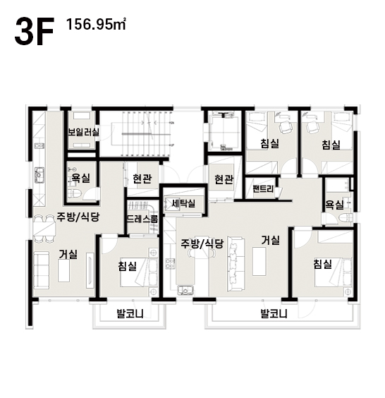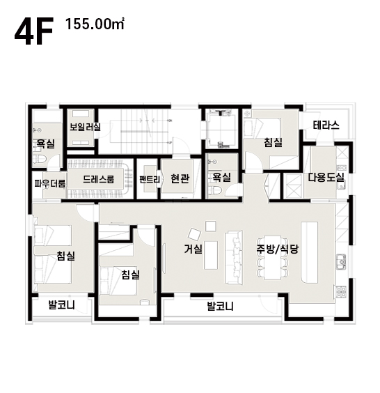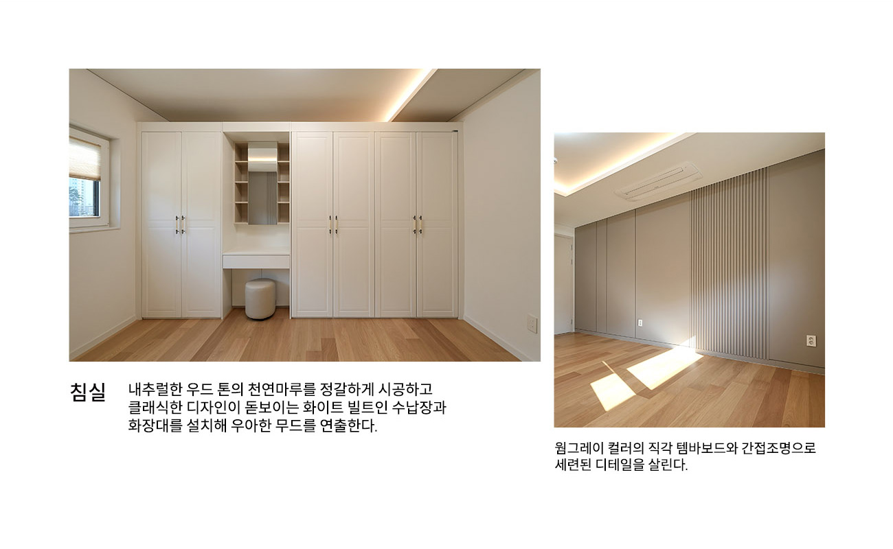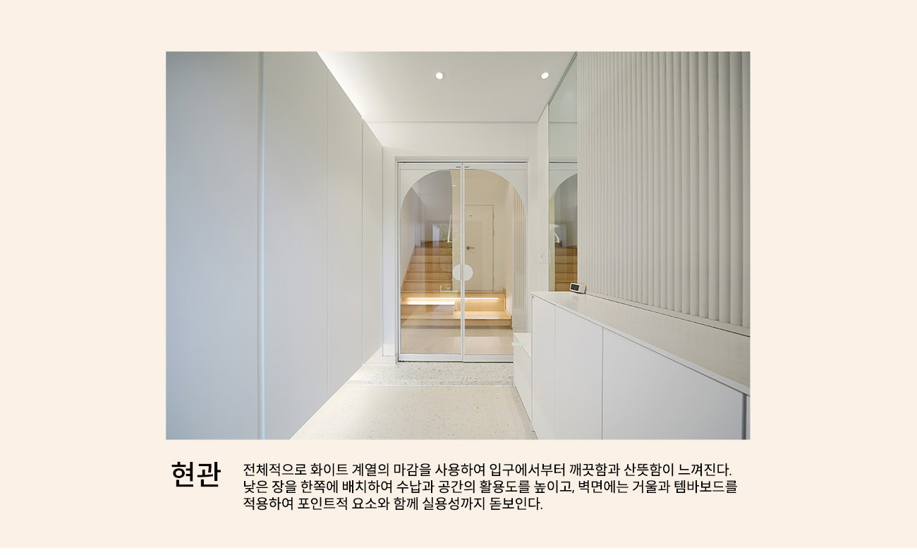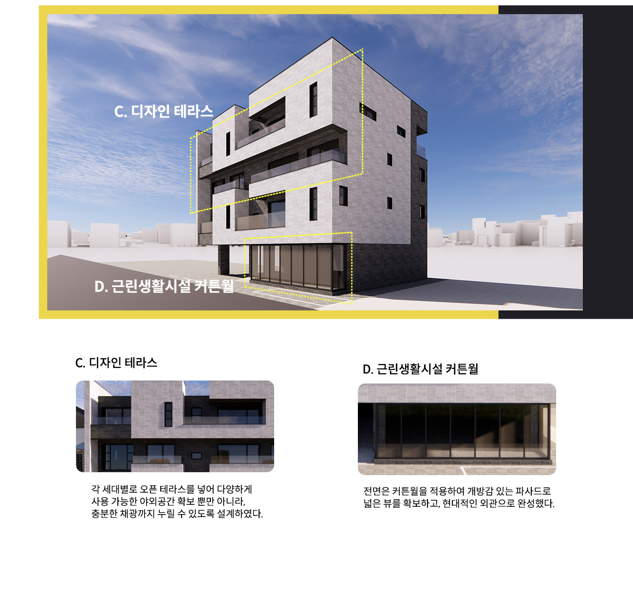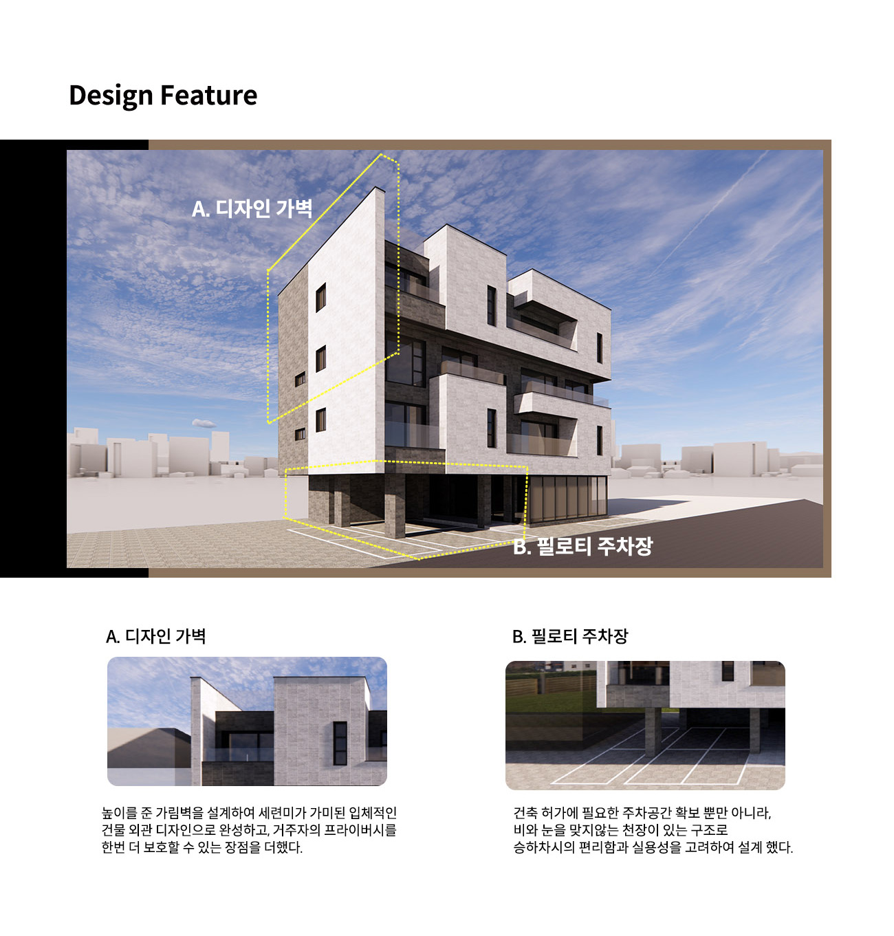 각 호마다 적당한 위치에 수납공간들을 구성하여 허투루 쓰는 공간 없이 모든 공간을 알차게 사용하도록 설계한 세심함이 돋보이는 평면이다. 1층은 상가는 전면 커튼 월로 개방감을 확보하여 어떤 업종이 들어와도 무난하게 사용할 수 있는 공간으로 구성하였고, 세입자를 위한 2,3층과 주인세대를 위한 4층은 남쪽으로 거실과 메인 침실을 두어 충분한 채광을 확보함으로써 기본적으로 밝은 집이 되도록 실들을 배치하였다. 또한 외관은 매스 자체만으로도 포인트가 되지만, 여기에 어지럽지 않도록 대비되는 두 가지 컬러의 외장재를 적절히 사용하여 돌출된 매스에 색 대비까지 더해 완벽한 입체감을 준 감각적인 디자인으로 완성했다.