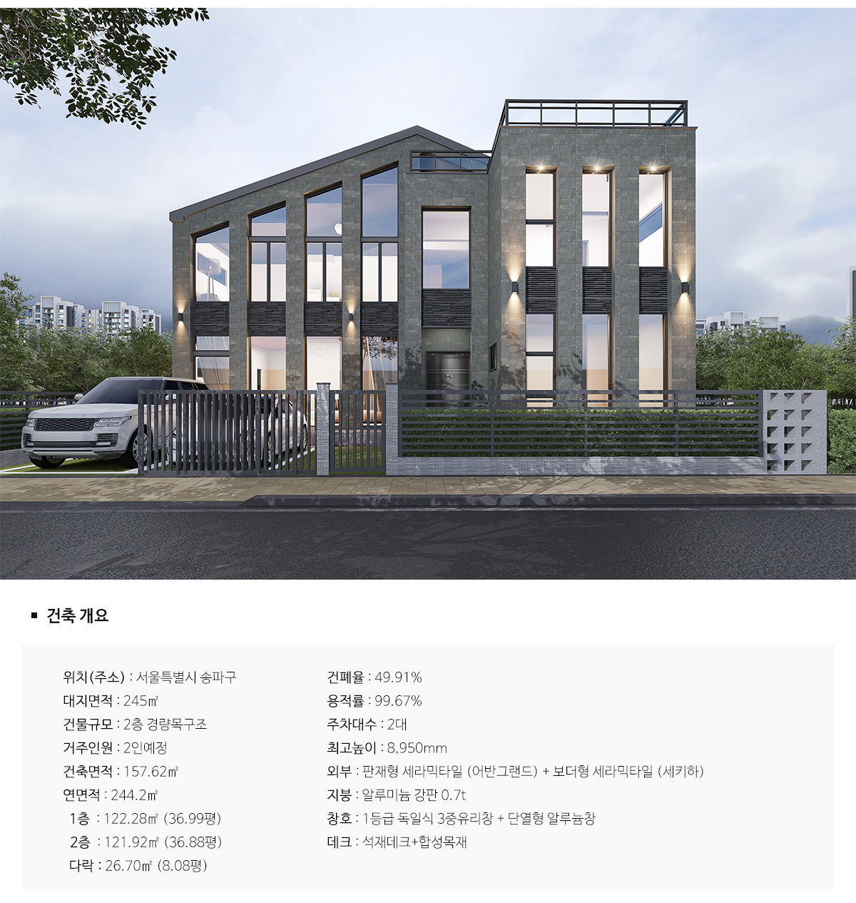 서울 송파구에 지어지는 이 주택은 일반적인 주택의 모양이 아닌 보다 선이 굵고, 전면 전체에 개방감을 줄 수 있는 디자인을 작용하기 위하여 연속성있는 창을 디자인요소로 사용하였으며, 모던한 느낌을 살리기 위해 박공에 평지붕 테라스를 가미한 디자인을 잡은것도한 특징이다.