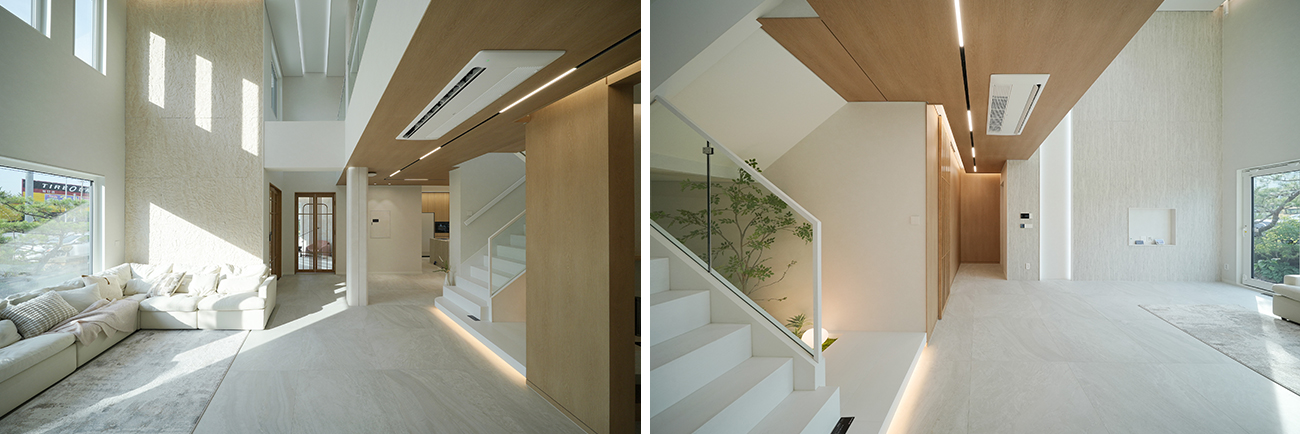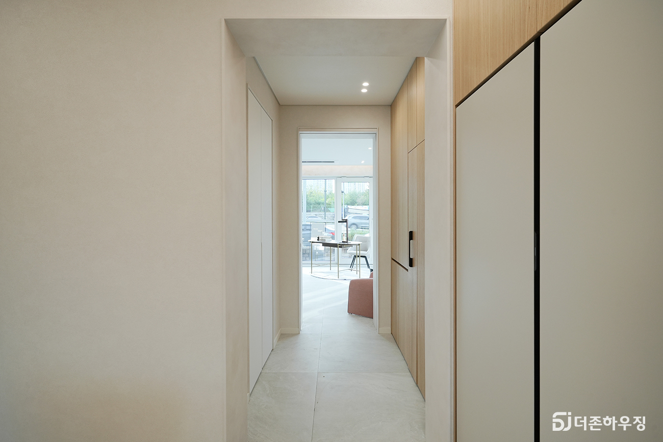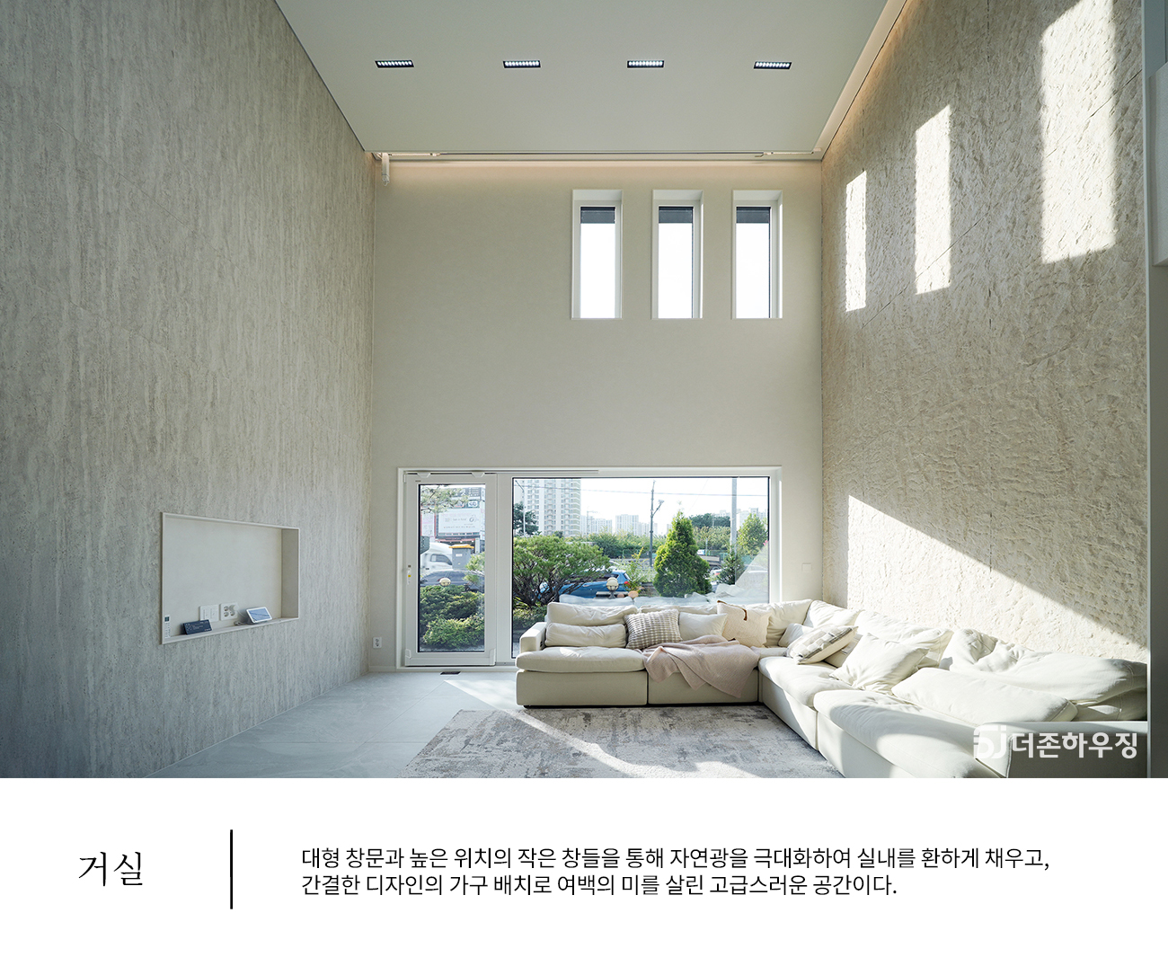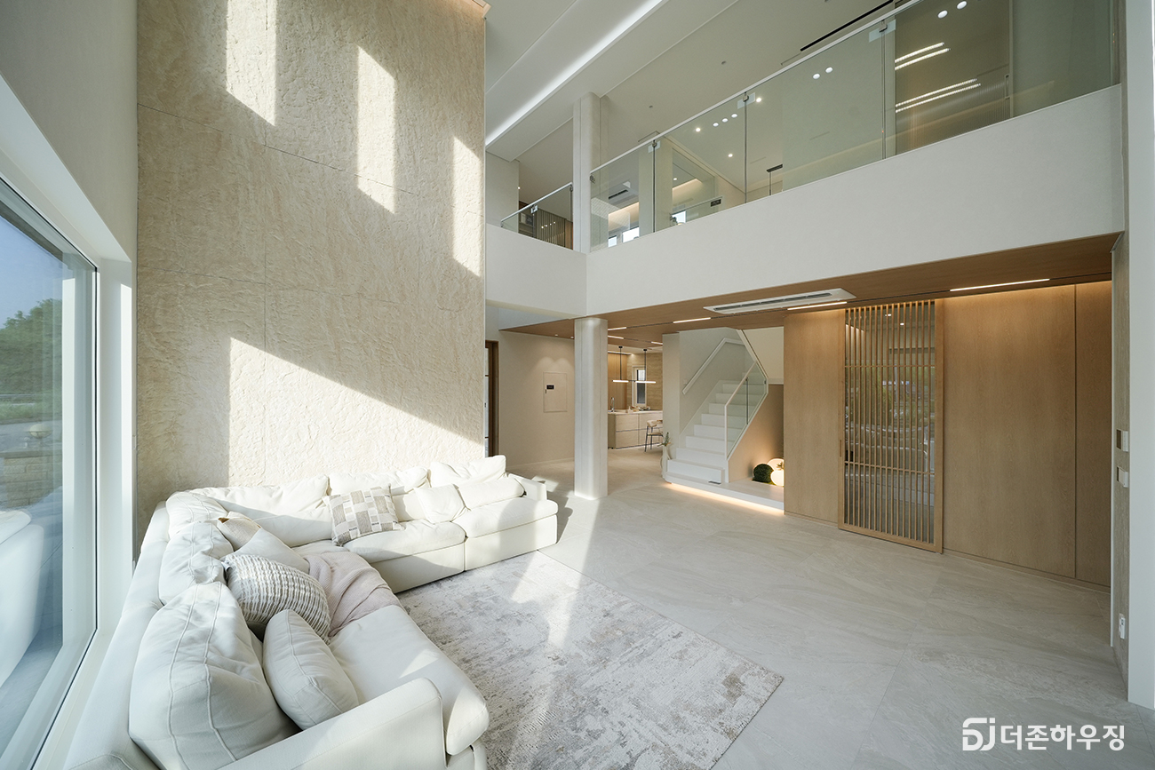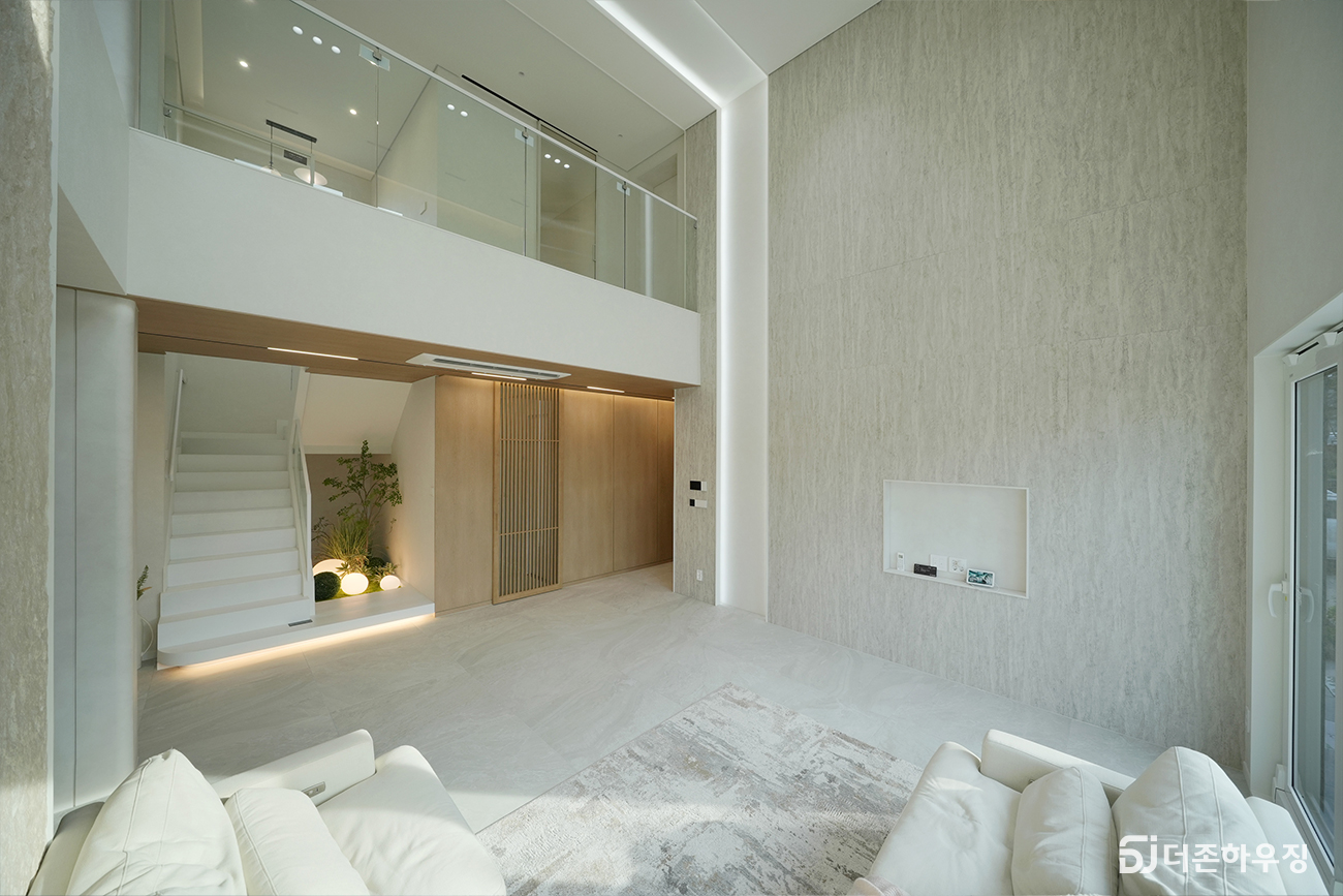 높은 층고를 활용한 개방감이 돋보이는 모던 미니멀리즘 컨셉으로 밝은 베이지 톤의 벽 마감재와 매립 조명이 차분하고 세련된 분위기를 연출했다.