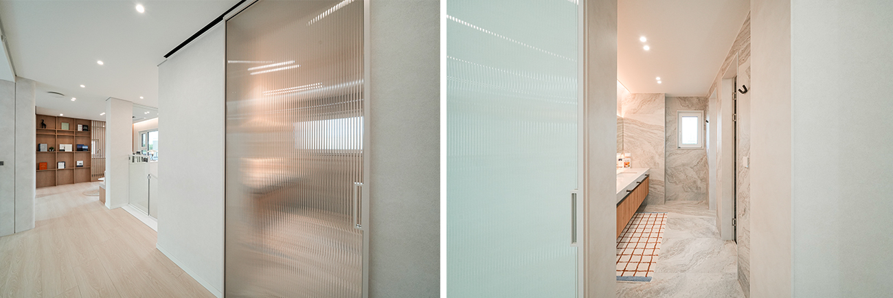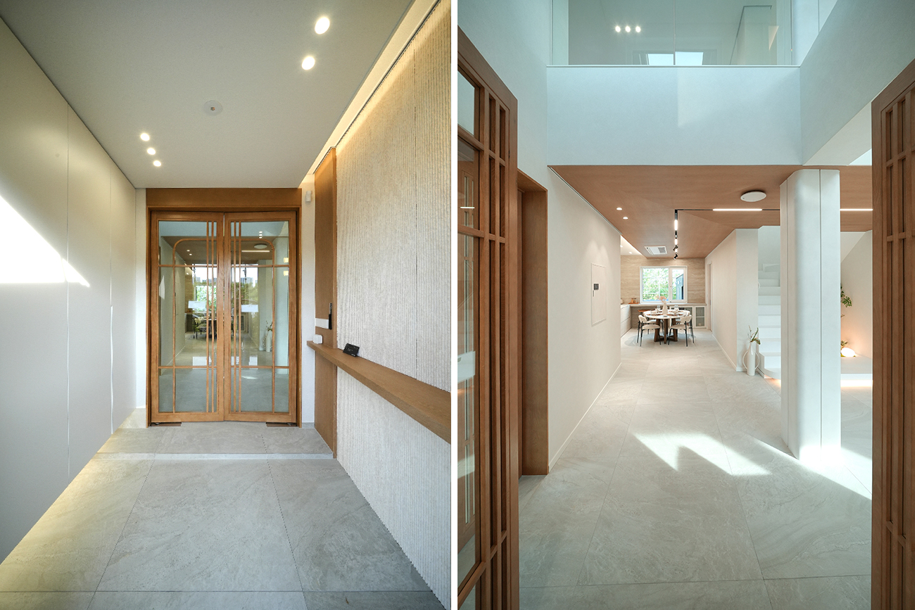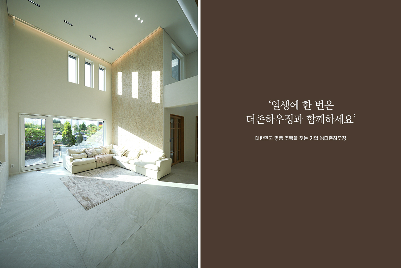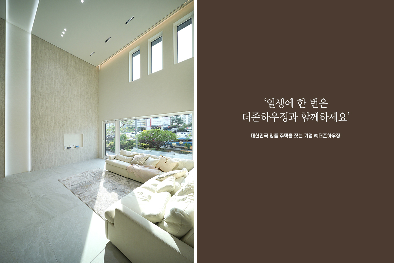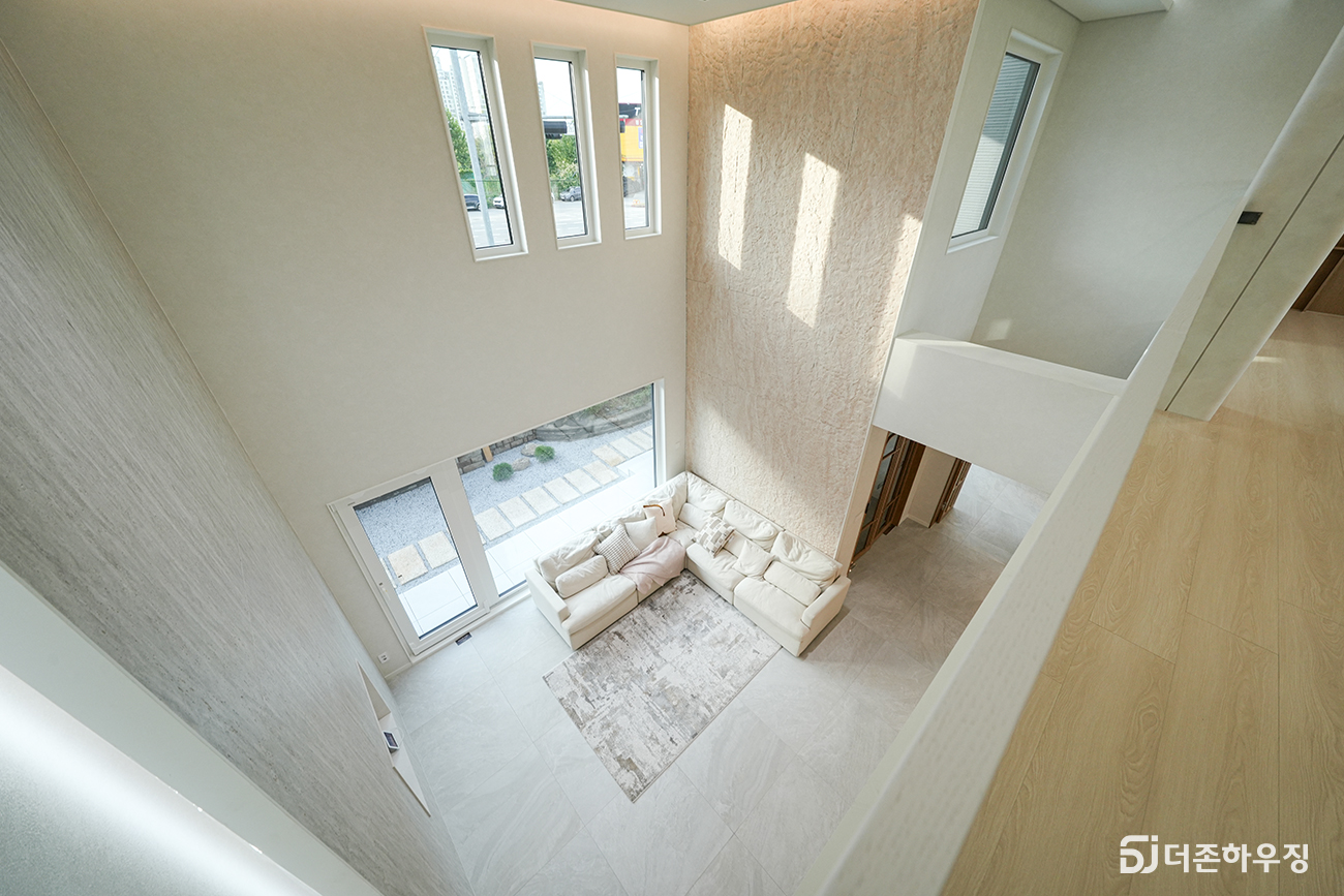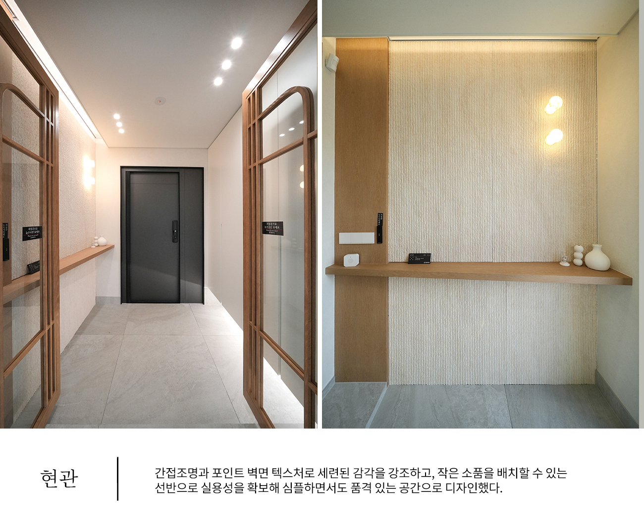높은 층고를 활용한 개방감이 돋보이는 모던 미니멀리즘 컨셉으로 밝은 베이지 톤의 벽 마감재와 매립 조명이 차분하고 세련된 분위기를 연출했다.