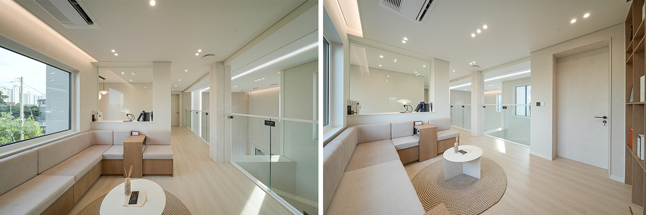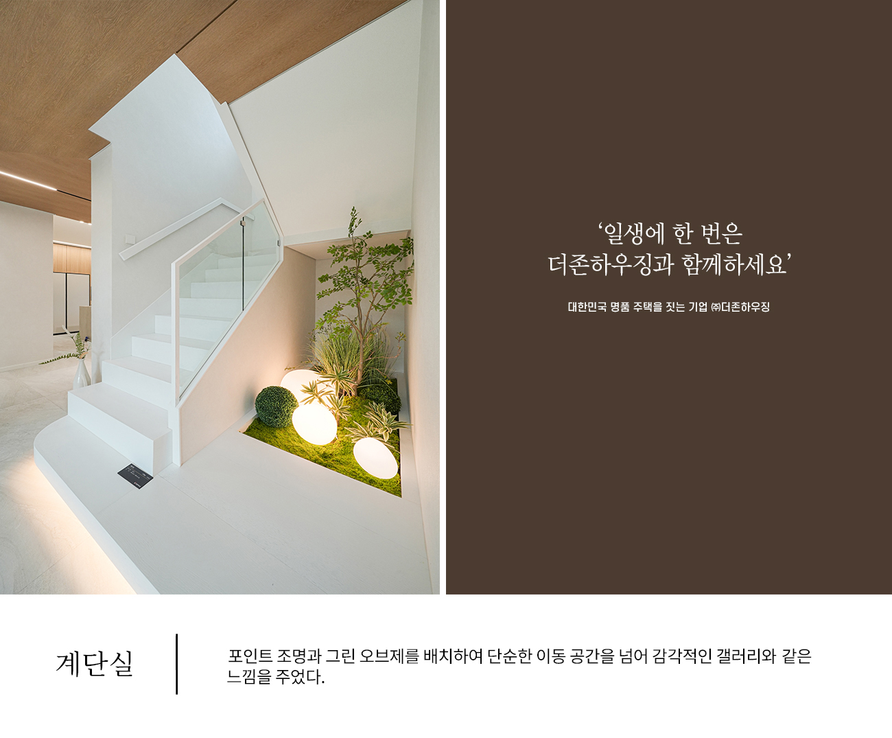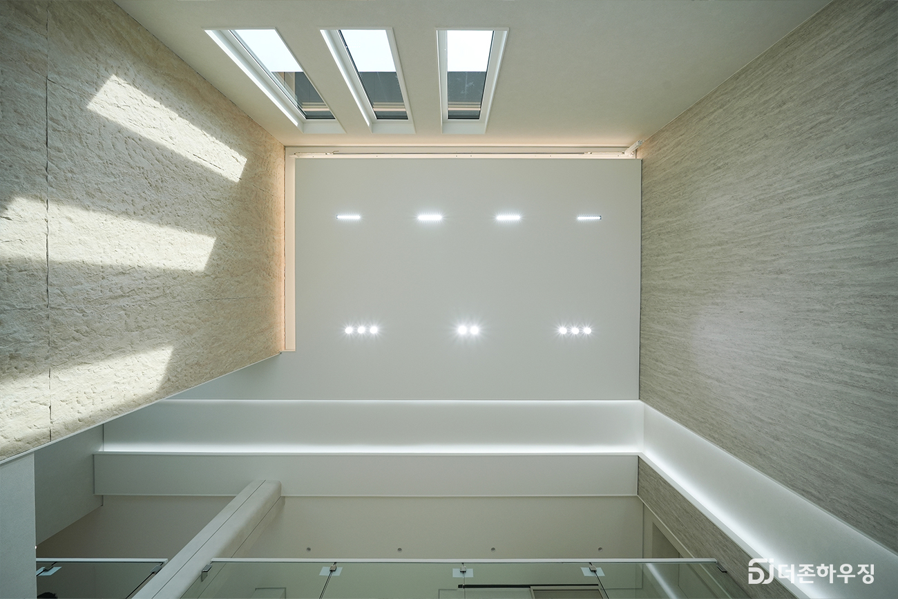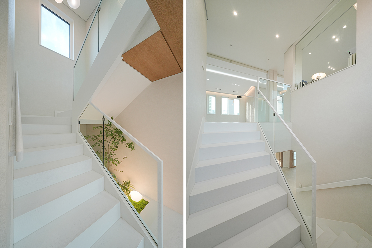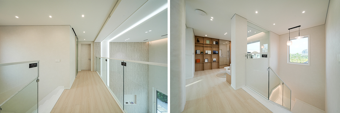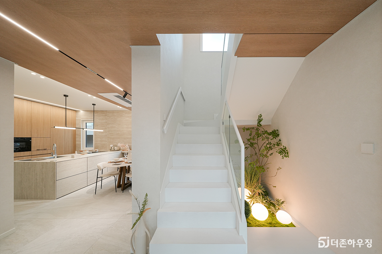 화이트 톤으로 마감된 계단실은 밝고 깔끔한 분위기를 강조하며, 공간에 확장감을 더한다. 투명한 유리 난간은 시각적인 개방감을 확보하고, 간접조명이 은은하게 더해져 세련된 분위기를 완성하였다.