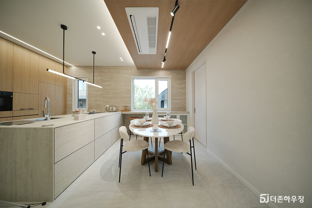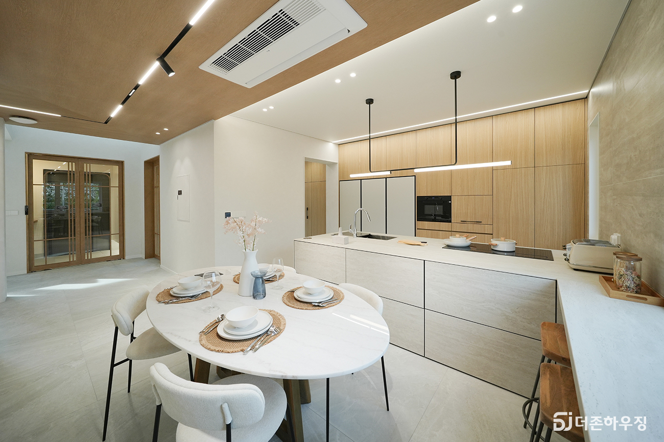 채광과 개방감을 살린 모던 주방과 식당 공간으로, 우드와 메탈 소재의 조화로 따뜻하면서도 세련된 분위기를 구현했다. 은은한 간접조명과 포인트 조명으로 공간마다 분위기와 기능성을 동시에 강조한 가족 중심의 생활 공간으로 완성했다.