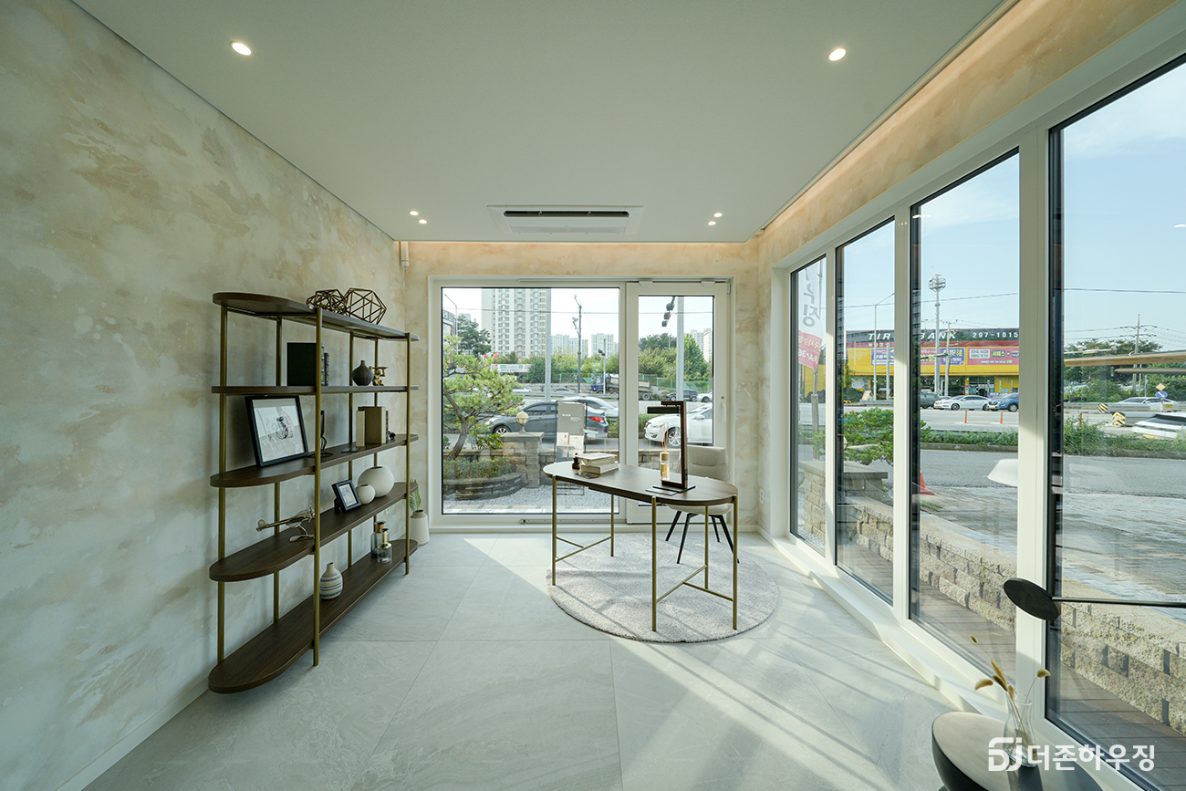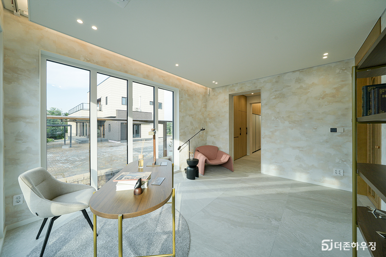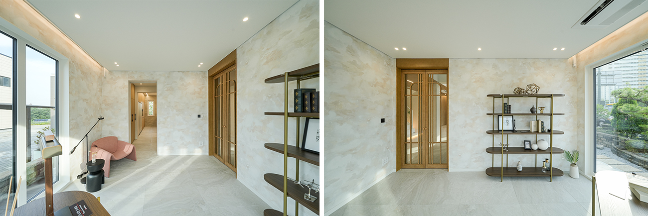 베이지 톤의 질감 있는 벽과 밝은 타일 바닥이 공간 전체에 부드러운 분위기를 형성하고, 여기에 진한 우드와 골드 디테일이 더해져 한층 고급스러운 감각이 느껴진다. 은은하게 퍼지는 간접 조명이 조화를 이루어 집중과 휴식을 모두 충족시키는 아늑한 공간으로 조성했다.