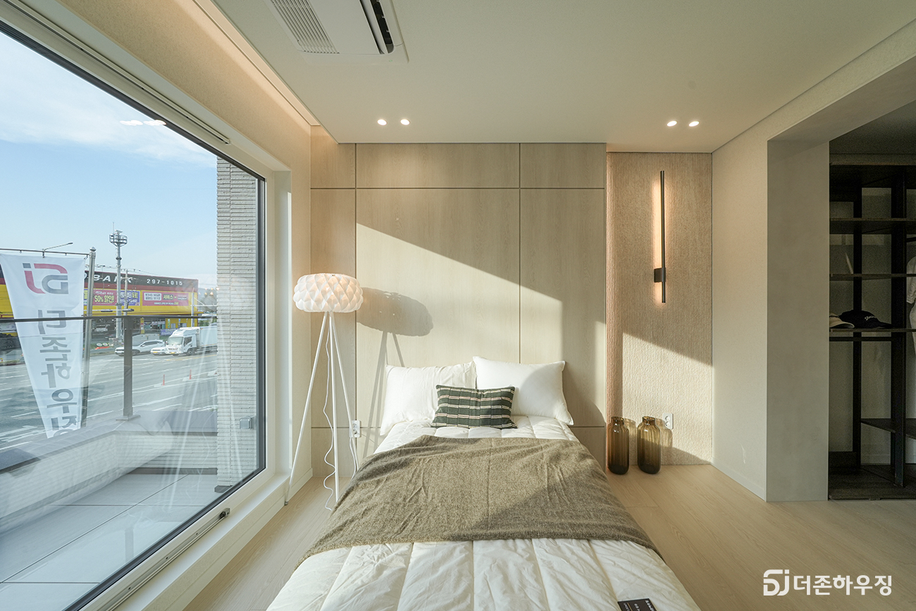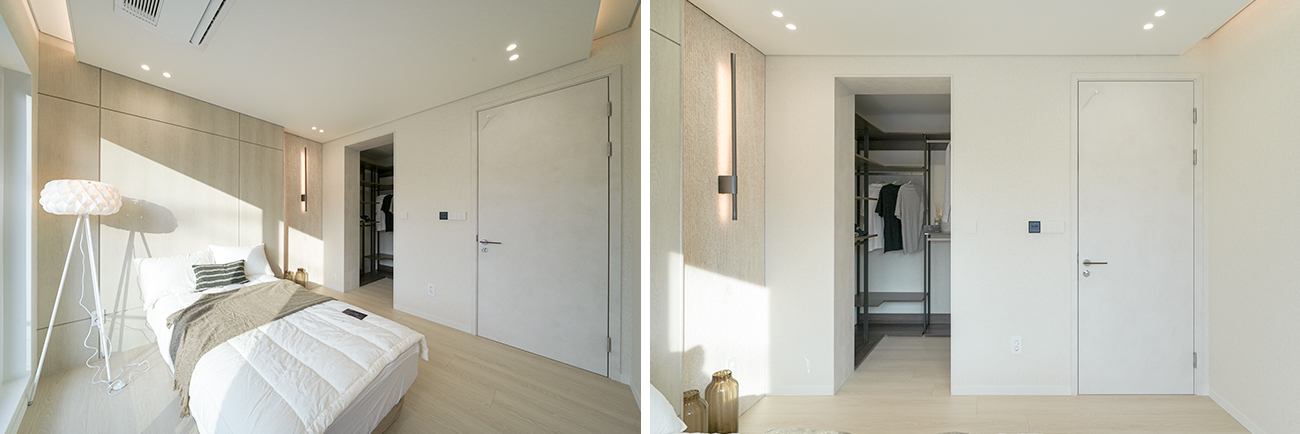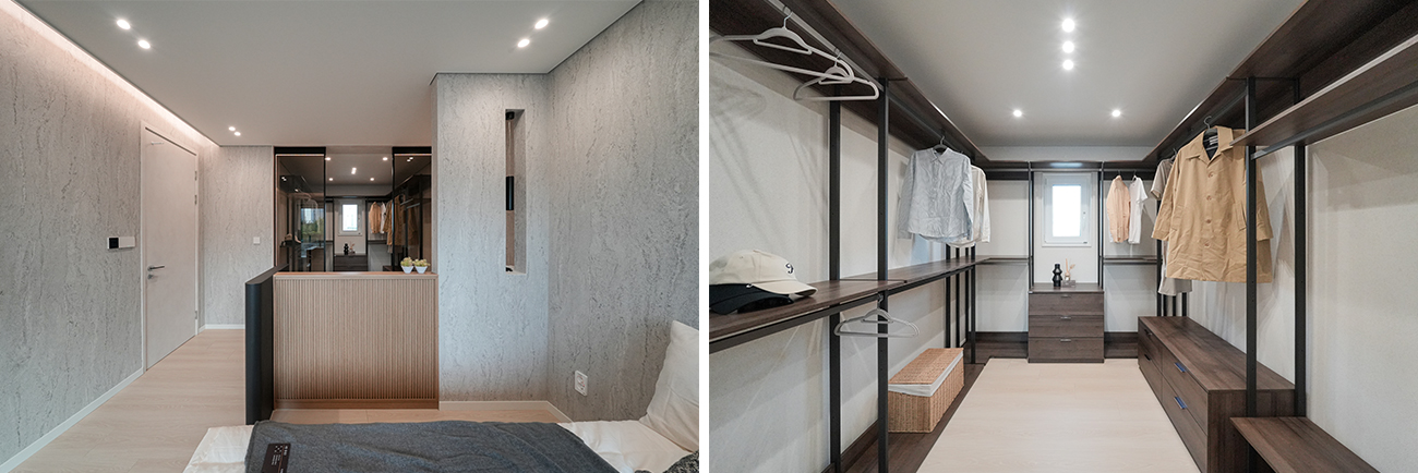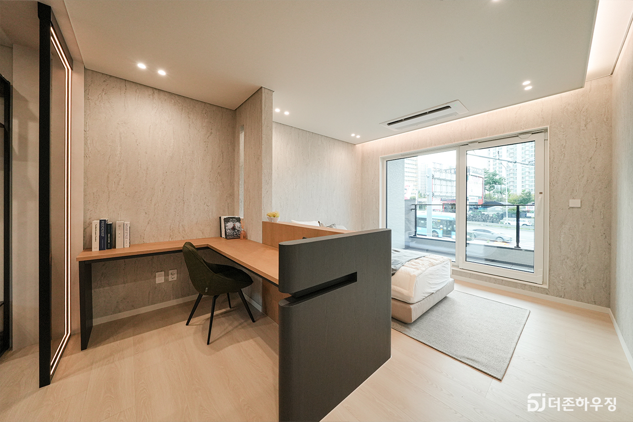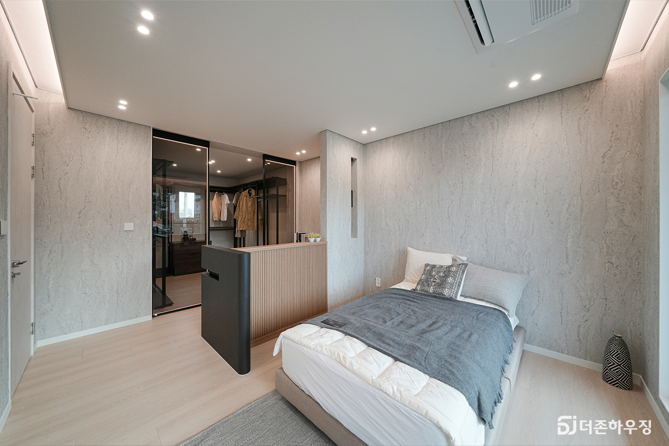 은은한 톤의 벽과 바닥이 편안한 분위기를 조성하며, 공간 분리를 위해 설치된 낮은 파티션은 침실과 작업 공간을 자연스럽게 구분하였다. 침실 한쪽에는 옷장과 연결된 동선이 있어 실용성과 편리함을 동시에 제공하며, 전체적으로 모던하면서도 편안한 휴식 공간으로 완성했다.