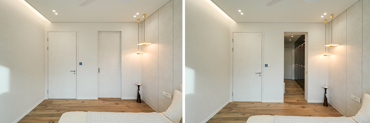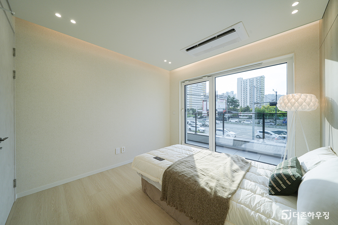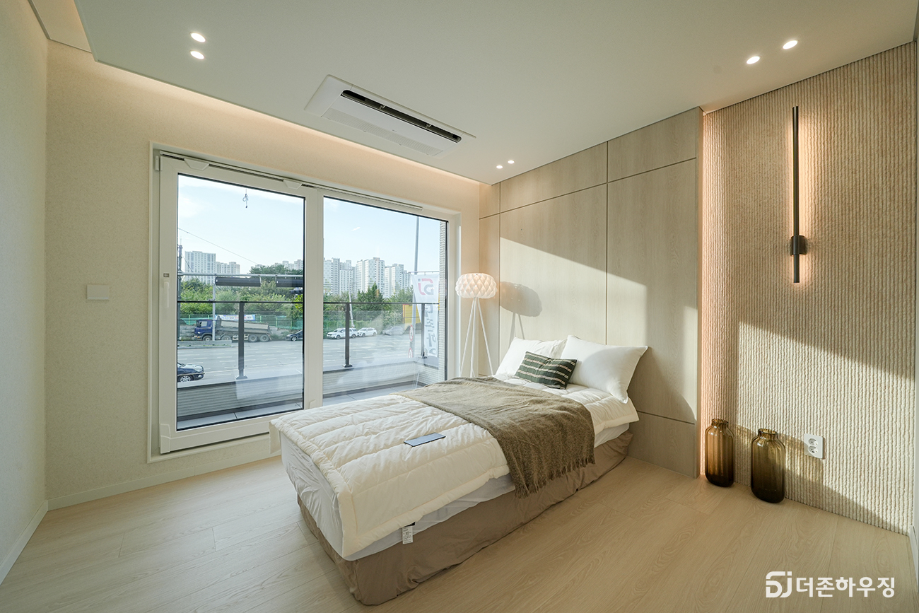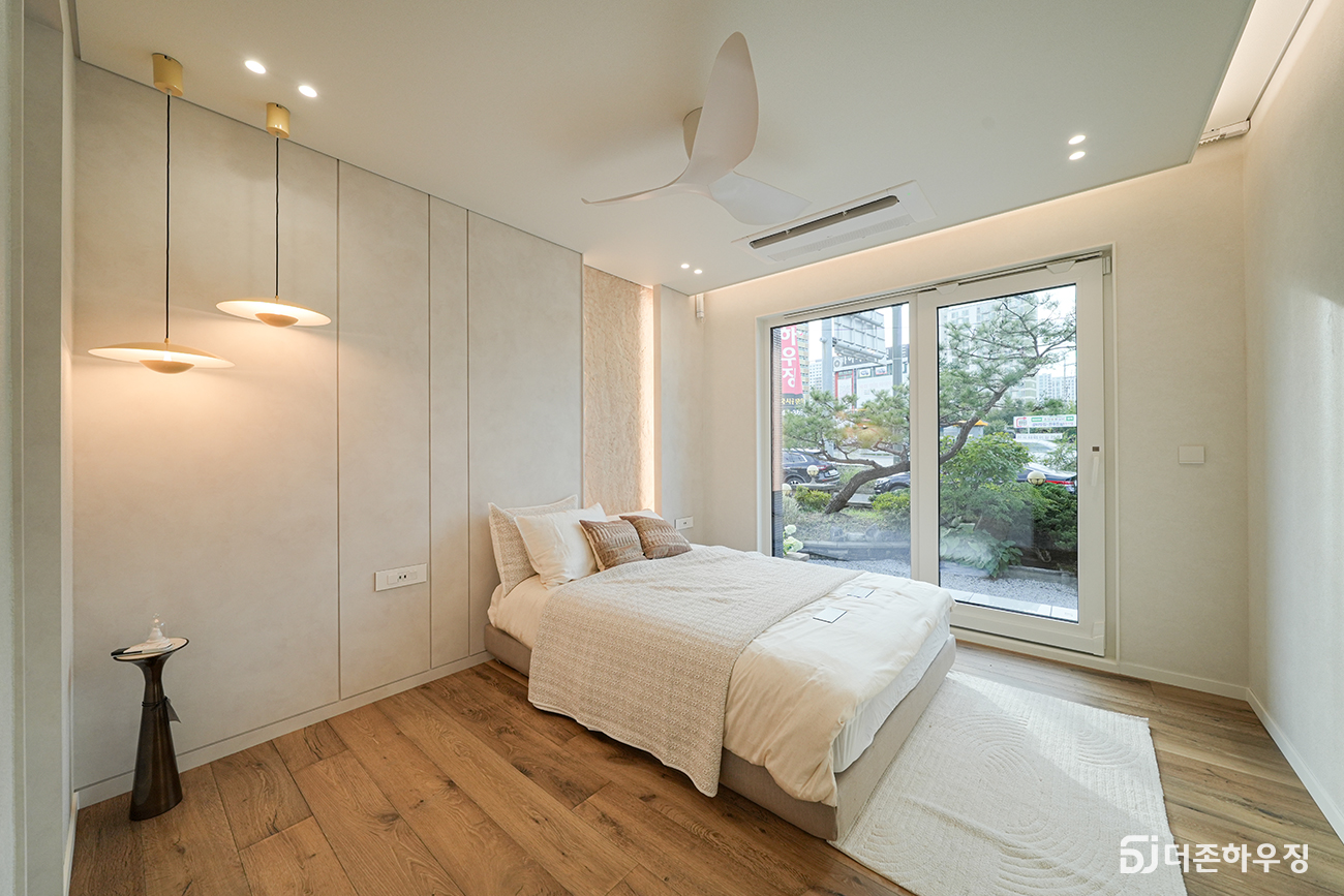 은은한 톤의 벽과 바닥이 편안한 분위기를 조성하며, 공간 분리를 위해 설치된 낮은 파티션은 침실과 작업 공간을 자연스럽게 구분하였다. 침실 한쪽에는 옷장과 연결된 동선이 있어 실용성과 편리함을 동시에 제공하며, 전체적으로 모던하면서도 편안한 휴식 공간으로 완성했다.