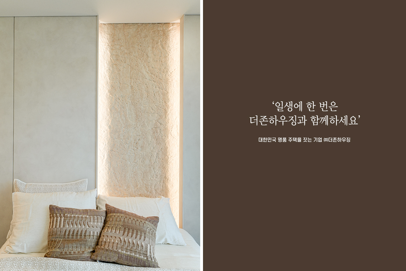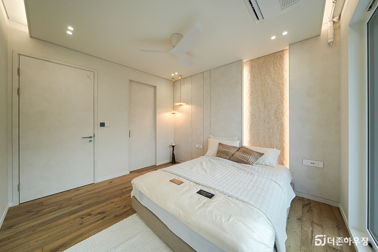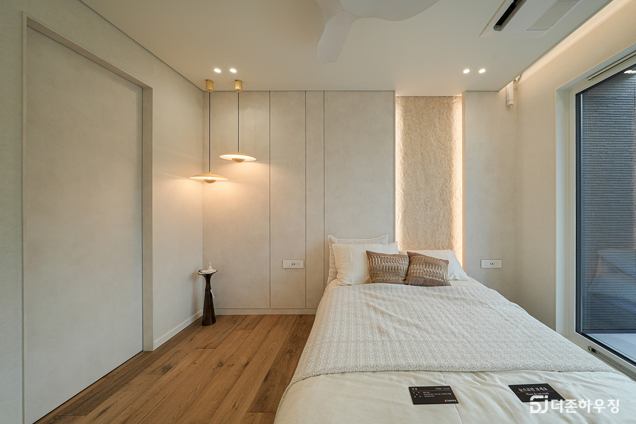 아이보리와 베이지 톤을 중심으로 부드럽고 아늑한 분위기를 연출한 침실로, 질감 있는 벽면과 침대 헤드보드에 적용된 수직 간접 조명이 공간에 입체감과 깊이를 더해 고급스럽고 세련된 무드를 완성한다.
