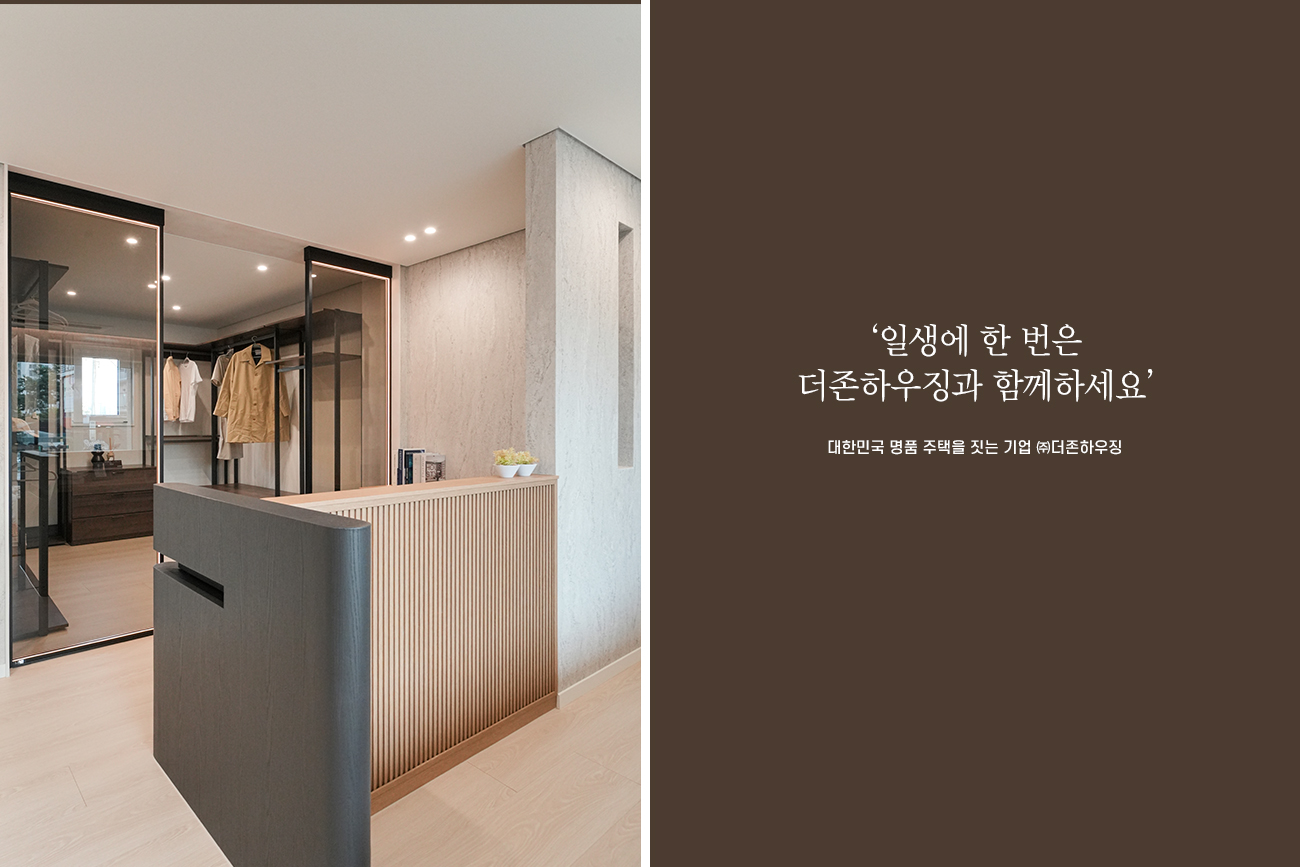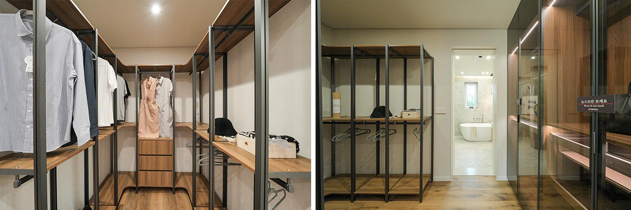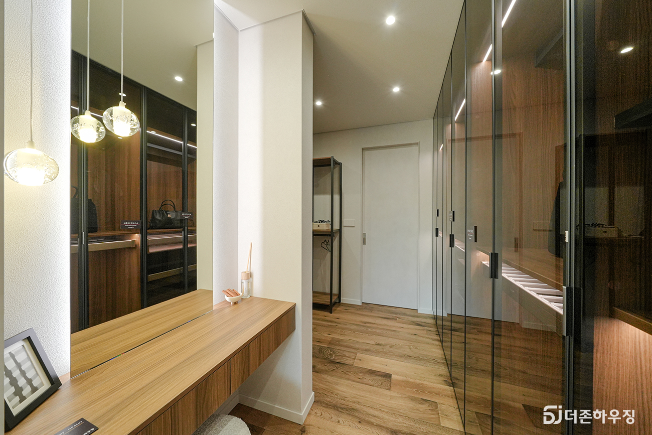 체계적인 수납과 모던한 디자인이 조화된 드레스룸으로 짙은 우드 톤의 바닥과 브론즈 유리 도어를 매치하여 고급 부티크처럼 세련된 분위기를 연출했다.