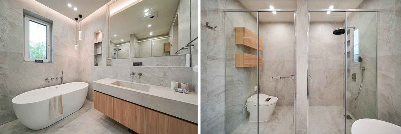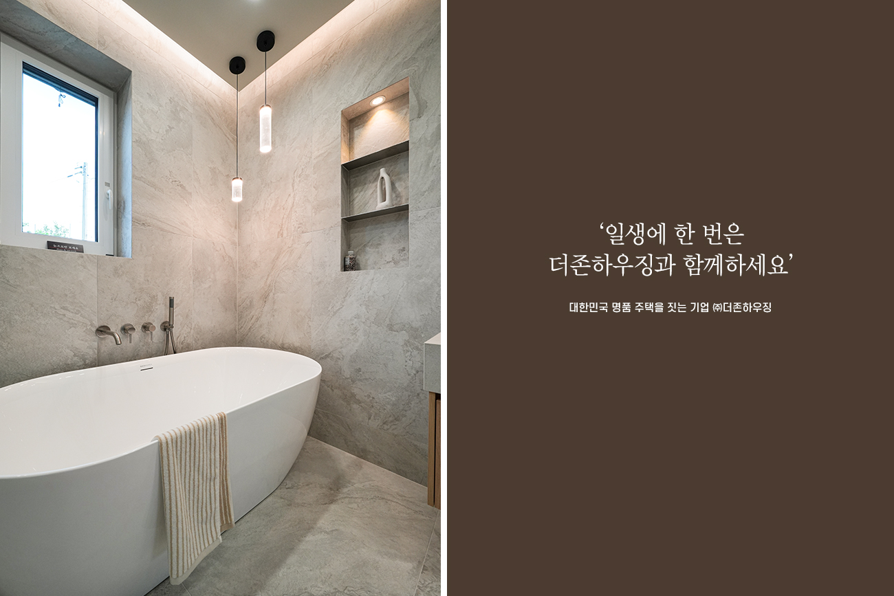 독립형 욕조와 우드 베이스의 넓은 욕실장, 그리고 연한 컬러 상판의 와이드 세면대가 어우러져 고급스러움 속에 편안함을 더했다.