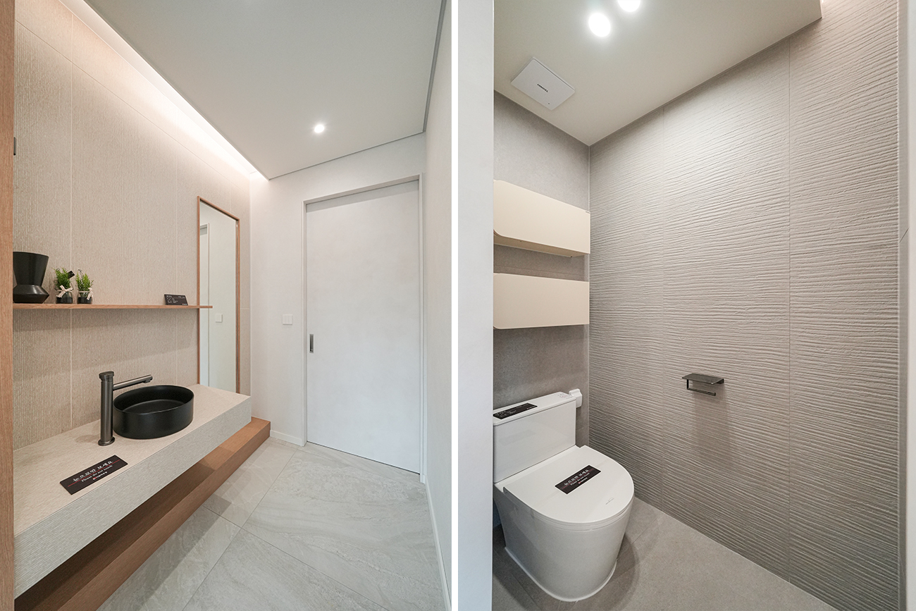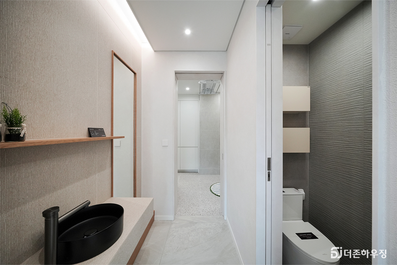 블랙 컬러의 탑볼 세면대와 매립형 수전으로 포인트를 주어 모던함을 더했으며, 은은한 간접 조명이 공간을 한층 아늑하고 세련되게 완성했다.