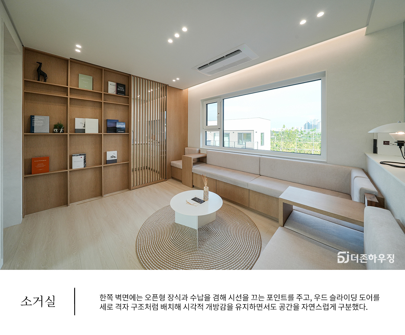 따뜻한 우드와 화이트 톤이 어우러져 아늑하고 세련된 분위기를 자아낸다. 벽면을 따라 이어지는 벤치형 소파는 수납과 좌석 기능을 동시에 갖추어 실용성과 디자인을 모두 충족시켰다.