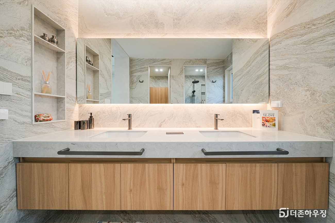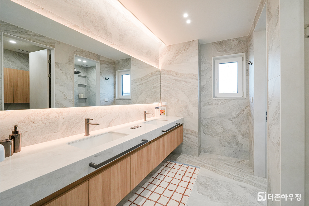 긴 대형 거울과 이중 세면대가 설치된 넓은 세면 공간은 실용성과 편의성을 동시에 갖추고, 간접조명이 더해져 은은하고 차분한 무드를 자아낸다.