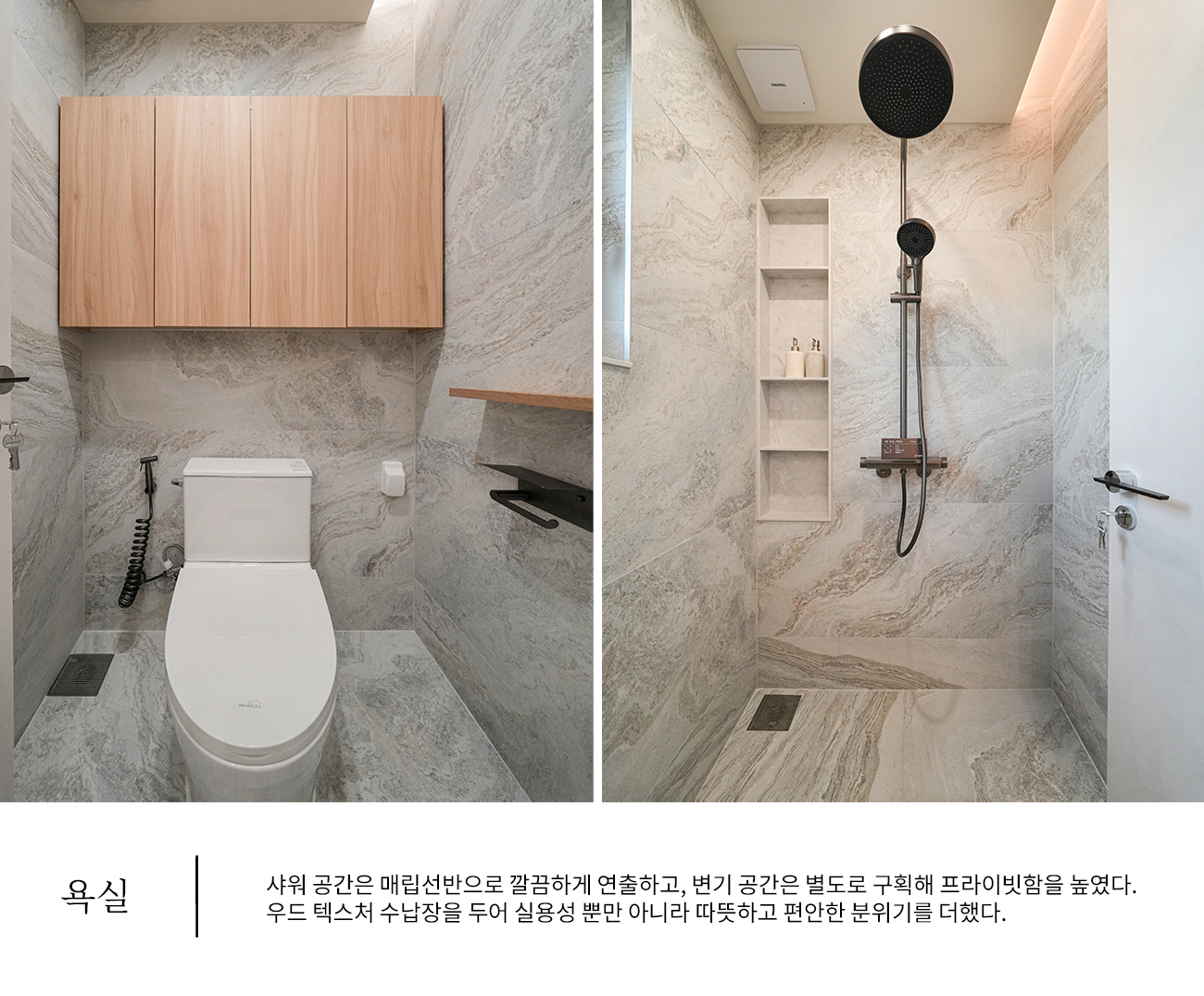 깔끔한 화이트 톤 벽과 그레이 타일 바닥으로 모던하고 밝은 분위기를 연출하며, 원목 프레임과 선반이 따뜻함을 더했다.