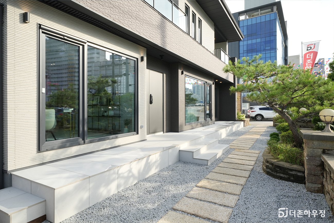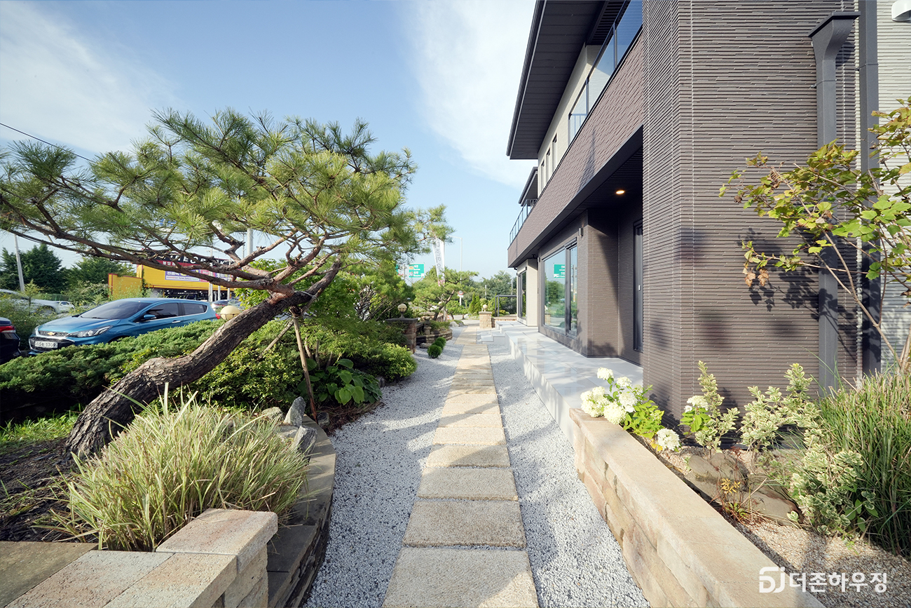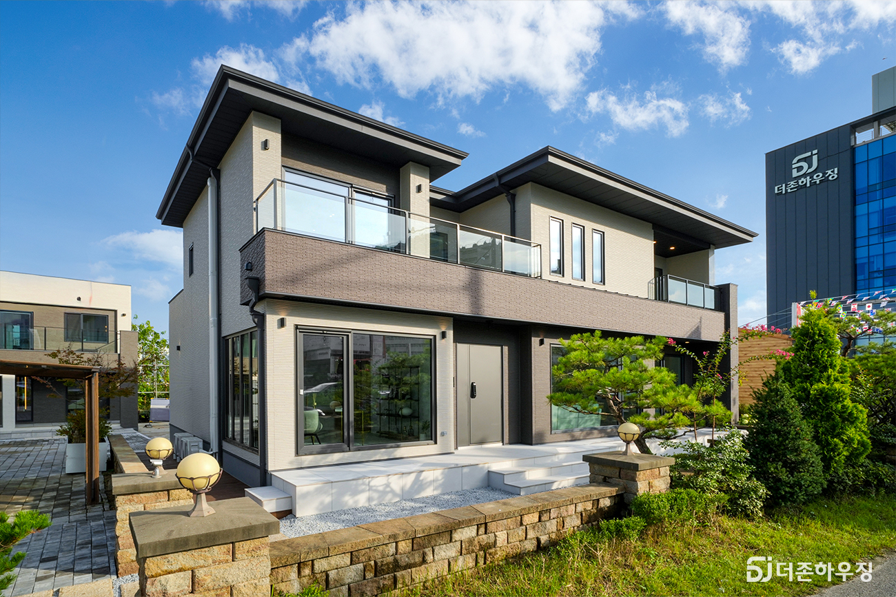 가족 구성원의 다양한 라이프스타일을 세심하게 고려한 설계로, 실용성과 여유를 동시에 담아낸 주택이다. 모임지붕을 적용한 외관은 균형 잡힌 비례감과 함께 차분하고 고급스러운 인상을 주며, 심플한 입면과 절제된 소재의 조합이 단정하면서도 세련된 분위기를 완성한다. 1층에는 프라이버시와 접근성을 고려한 메인 침실을 배치해 편리한 동선을 확보하고, 2층에는 안방 수준의 넉넉한 침실과 독립적인 생활 공간을 마련해 2세대가 각자의 라이프스타일을 존중하며 생활할 수 있는 구조를 갖췄다. 또한, 각 층의 공용 공간과 외부 조경은 자연광과 조망을 극대화하도록 설계되어 가족 모두에게 쾌적하고 여유로운 주거 경험을 제공한다.